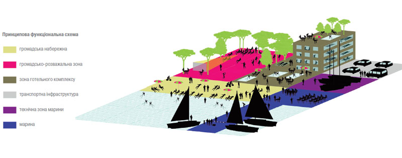Олег Дроздов: Публічний простір можна означити як інфраструктуру, яка сама є комплексним поняттям і вміщує багато змістів. Це простір, пов’язаний із певними типами громадської діяльності, такими, як спілкування і дозвілля, простір, що створює місце для прогулянок і відпочинку. В якомусь сенсі публічний простір є синонімом якості життя в місті, навіть синонімом самого міста, значення якого розкривається через такі просторові структури, як парк, площа і вулиця. Разом із тим, важливо розуміти, що такого типу простори не тільки генерують різноманітні сюжети і роблять місце насиченим, а й являють собою справжні ресурси з точки зору економіки, визначаючи рівень привабливості того чи іншого об’єкту і безпосередньо впливаючи на купівельну активність. Ідею використання публічного простору як туристичного ресурсу, закладену в проекті штучних островів для Одеси, «Намисто», ми зараз реалізуємо в проекті меншого масштабу — Яхт-клубі на місці Кораблебудівельного заводу на м. Ланжерон. У проекті пасажирського порту для Ялти термінали, розташовані понад рівнем набережної, залишають можливість вільного контакту з морем. Якщо йдеться про берег, ключовим елементом публічного простору є пірс, який дозволяє людині наблизитись до морських обріїв, опинитись на самому вістрі взаємодії зі стихією. При цьому громадська і комерційна функція не виключають одна одну, але гармонійно взаємодіють.