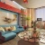 Стилистическое решение Увлекательное трио цвета, форм и изгибов. Сливочная гамма цвета, мебели, отделки и аксессуаров воссоздают идиллию острова посреди морской лазури. Интерьер – словно глоток истинного наслаждения в водовороте образов и приятных эмоций. Этому способствуют самые современные материалы отделки. Опуск по периметру потолка привносил дисгармонию в интерьер. Этот недостаток завуалирован при помощи витиеватых светящихся декораций на потолке. Их плавные линии постепенно спускаются на стену под камин, создавая оригинальный орнамент в виде небольших островков гдето в Тихом океане. В голубой рамке, как с экрана, смотрит, прищурено грациозная кошка. Это – игровая комната для подростка. В помещении использована паркетная доска – зебрано, которая вновь на пике популярности. Для созвучности материалов потолок выполнен в дереве.