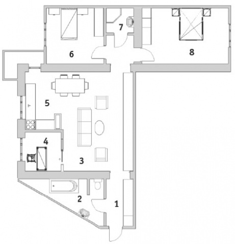 Перепланировка После небольших маневров с перепланировкой квартира абсолютно преобразилась, стала казаться намного больше, просторнее, появилось два дополнительных помещения. Объединением кухни и гостиной получено одно большое открытое пространство. Часть длинного проходного коридора добавили к гостиной, а на месте бывшей кухни появился маленький уютный кабинет для хозяина. Демонтирован простенок между санузлами – получилась одна большая ванная комната, а на месте старой кладовки оборудован еще один гостевой санузел.