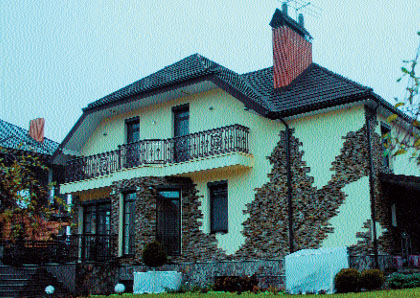 Снаружи переделан фасад. В частности, стену дома решено облицевать серым декоративным камнем. Выполненный из него "рваный" абстрактный рисунок то резко "поднимается" вверх, то стремительно "падает", то обнажает светлый фасад, придавая коттеджу вид необычный и привлекательный.