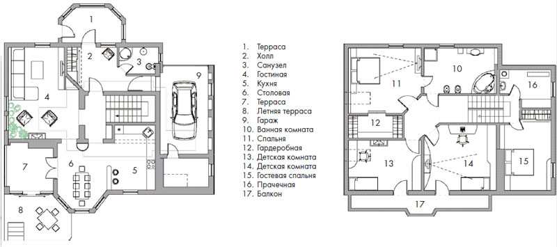 На первом этаже дома разместили столовую и гостиную, в цоколе — бильярдную, гардеробную. Второй этаж представлен гостевой, детскими и спальней для родителей.