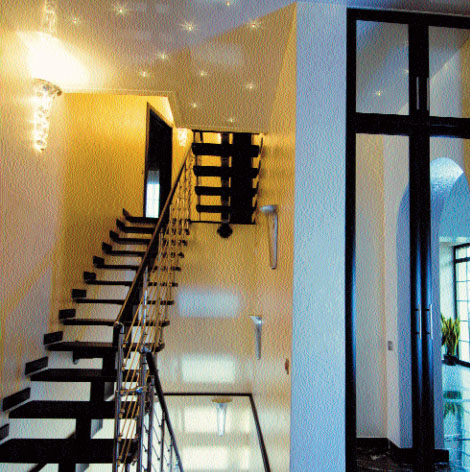 С первого этажа лестница ведет в полуподвальное помещение. Освещают ее "звезды" Swarovski на потолке.