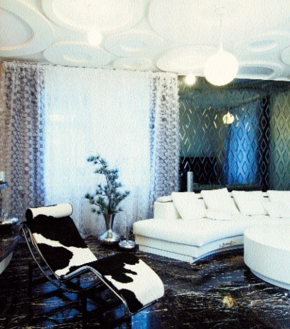 Особого внимания в гостиной заслуживает потолок. Он выполнен из двух различных текстур. За счет округлых декоративных элементов создан эффект объемности потолка. Сделано это с использованием матовых колец — задувка сабулы, — которые обрамляет глянец из венецианской штукатурки. "Округлая" концепция как по форме, так и по цвету отображена в мебели комнаты. К слову, вся мебель в интерьере объекта — CLASS INTERIORS, дорогая, респектабельная, с отменными эксплуатационными характеристиками.