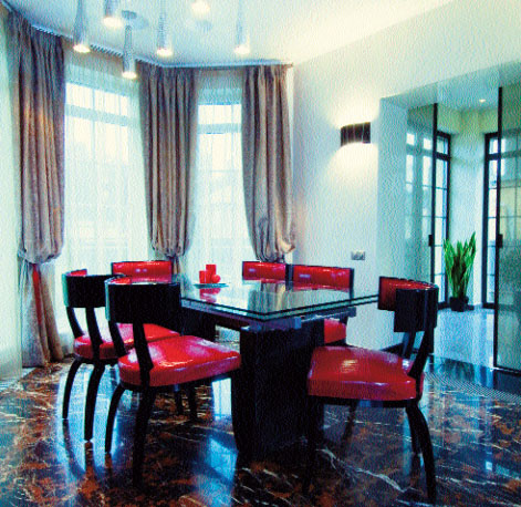 Стиль столовой можно охарактеризовать как современная классика. Цветовая гамма представлена сочетаниями красного, черного и их оттенков. При этом доминирует перламутровый красный, который, к слову, способствует повышению аппетита. Весьма оригинально смотрится напольное покрытие из мрамора красновато-оранжевого цвета. Шторы ТРОПША СТУДИО в комнате дополняют образ неброскими спокойными оттенками лилового. Цвет кухни ASTER — сочный акцент вишни с перламутром во всем интерьере. Часть мебели комнаты обита настоящей кожей угря. Надо сказать, что это весьма удачное решение дизайнера.