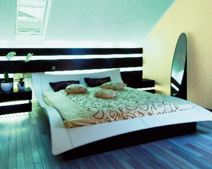 Изысканно и современно смотрится декоративная панель у изголовья кровати, обтянутая кожей угря. Потолок выполнен в технике белой венецианской штукатурки. Двери и лестница предоставлены Академией Интерьера. Световое оформление создано благодаря осветительным приборам от компании АЛЬТЕР-ЛАЙТ, а приятные мелочи, аксессуары и цветовые композиции подобраны с УКРФЛОРА.