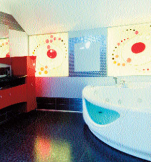 Оформление этой части дома было бы вполне обычным, если бы не одно "но": яркий алый цвет сантехники АКВАСИСТЕМ. Это смелое цветовое решение, выбранное дизайнером, по-современному организует пространство, выделяет его среди других комнат. Удачным дополнением комнаты стали абстракции ярко-алых маков. Эскиз работы был предоставлен художником-дизайнером Эдуардом Бедратым.