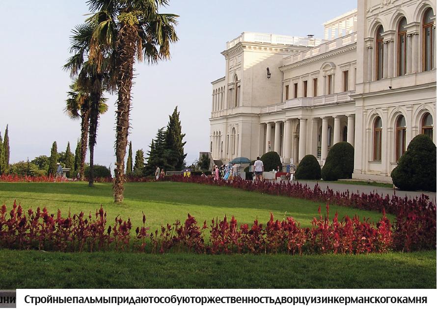 Сегодня любой маршрут прогулки по парку начинается от большого Белого дворца. С севера – большая площадка, украшенная цветниками. За ней – небольшие полянки, красиво ограниченные группами и рощицами кедра ливанского и дуба летнего пирамидального. Ближе к оранжерее очень эффектна группа из пяти деревьев дуба пушистого в соседстве с буйно разросшимся голубым кедром. И через дорогу высится накренившаяся секвойя гигантская, которая не позволяет сделать цельный панорамный снимок дворца – как там ни приседай, и не выворачивайся. В стороне от юго-восточного угла дворца растет мощный тис ягодный колонно-видный. Он контрастирует необычной формой своего габитуса и густой темно-зеленой хвоей с нежной зеленью лужайки и голубовато-пепельным силуэтом Никитской яйлы. А у главного входа во дворец можно заметить, как подпорная стена оформлена большими терракотовыми вазами. С восточной стороны дворца и свитского корпуса, прилегающие к ним крутые участки выглядят подчеркнуто парадно за счет террасирования и устройства архитектурно выполненных подпорных стен.