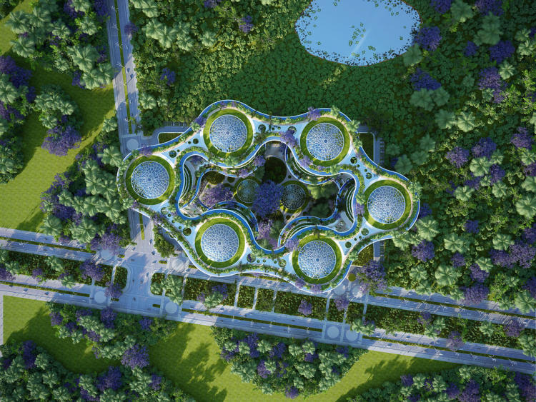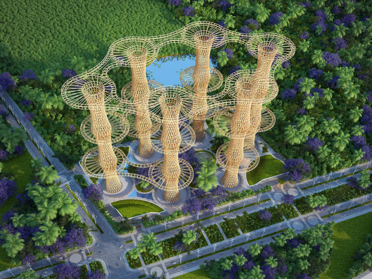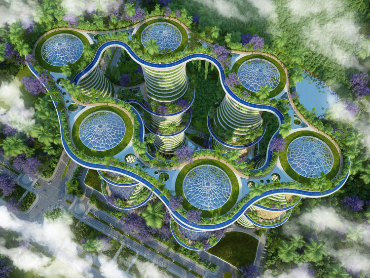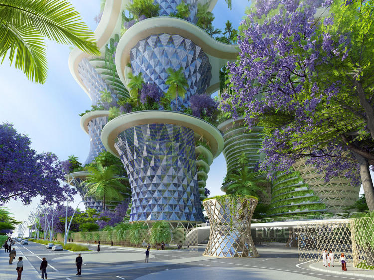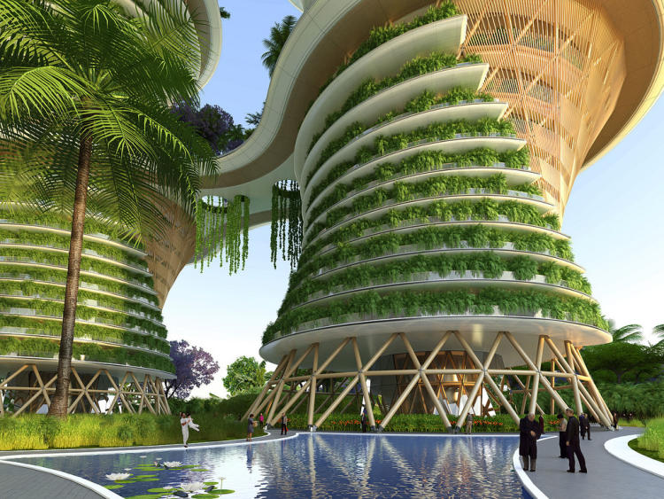 Эко-город гармонично совмещает в себе природность и использование современных технологий. Комплекс включает 6 башен, этажность каждой составляет 36 этажей-садов. Тут будут находиться как жилые апартаменты, так и офисные помещения. На каждом этаже в свою очередь будет разбит сад с типичными растениями для данной местности. Между собой все башни будут соединены подвесными мостами.