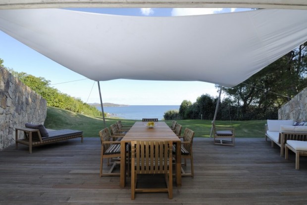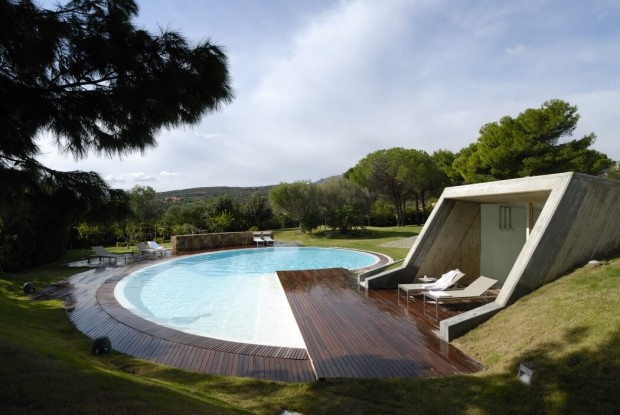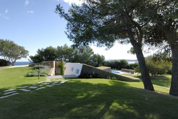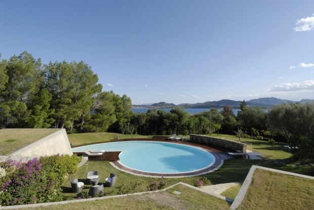Проект «О» – нашел свое пристанище на острове Сардиния в Средиземном море. Вилла выполнена в достаточно смелом стиле и удобно расположилась на первой линии залива Portisco в самом сердце Изумрудного побережья. Особенность здания состоит в том, что когда на него смотришь сверху, то оно настолько сливается с местным ландшафтом, что становится незаметным для людского глаза.