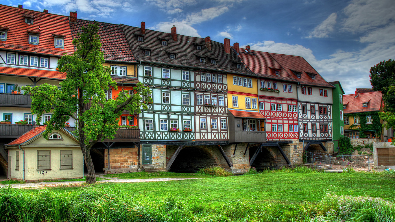 Это Торговый мост или мост Krämerbrücke – одно из самых старых сооружений торгового назначения, сохранившееся до нашего времени. Можно смело сказать, что это символ города Эрфурта, Германия.