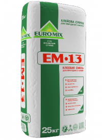 Клеевая смесь «EUROMIX «EM-13» предназначена для внутренней и наружной облицовки прочных минеральных оснований (тяжёлый бетон, ячеистый бетон, кирпич, штукатурка и т.п.) всеми видами плитками из природного камня, плотного бетона, литого камня. Благодаря высокой водостойкости и морозостойкости применение клея эффективно на основаниях, подверженных периодической деформации, связанной с увлажнением и расширением (внутренние бассейны и резервуары, душевые кабинки, балконы, террасы, обогреваемые полы и т.д.).