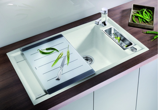 - Скользящая вдоль поверхности разделочная доска позволяет сбрасывать нарезанные продукты непосредственно в посуду, стоящую в чаше мойки